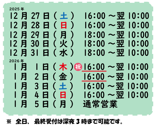 年末年始の営業案内 2025年12月1日2025年12月1日お知らせ 年末年始休まず営業! いつも当店をご利用いただきありがとうございます。年末年始の営業時間を下記の通りとさせて頂きます。 皆様のご来店をお待ちしております。