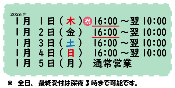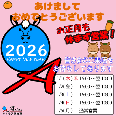 2026年1月1日2026年1月11日お知らせ 新年営業の案内 正月も営業中 謹んで新春のお慶びを申し上げます。旧年中は当店をご利用いただきありがとうございました。 本年もより一層お客様に快適にご滞在頂けるようイベントやサービスを計画しておりますので引き続きご愛顧賜りますよう宜しくお願いします。なお、年始営業時間を下記の通りとさせていただきます。 続きを読む